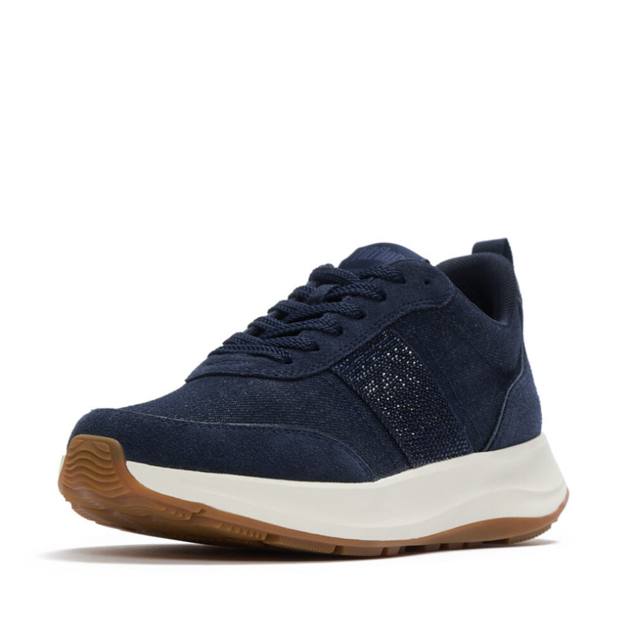 The effortless styling of go-to denim makes its way to your footwear. Two staples of your casualwear wardrobe collide to create our denim F-Mode trainers. They have a classic, easy-to-pull-on silhouette that's detailed with tonal, tactile suede panels and sparkling crystal embellishments studded along the sides. Built on our signature Microwobbleboard™ midsoles, these everyday trainers deliver triple-density cushioning that works in harmony with your natural gait: firm at the heel for impact absorption, soft through the middle for maximum comfort, and medium-density at the toes to push you forward. The result? Footwear that helps to optimise your everyday movement – while keeping you effortlessly on-trend.